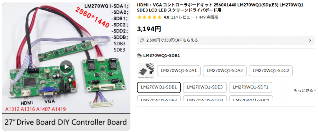 AliExpressでパネル型番に適合するコントローラボードを探して、購入してみました